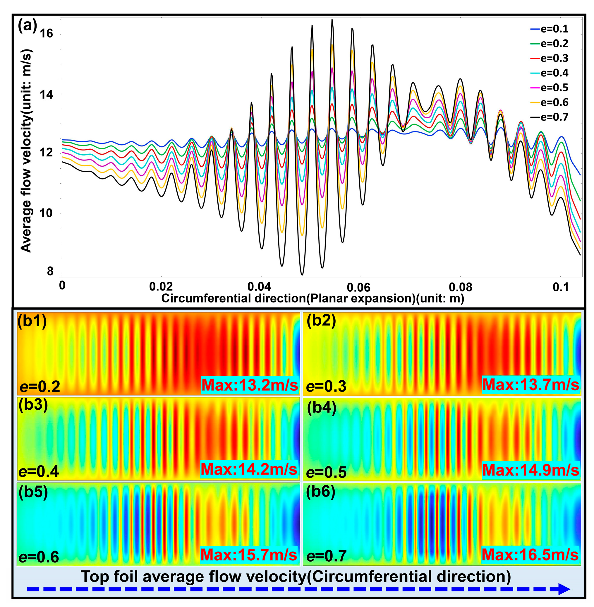 Figure 15, it can be observed that as the eccentricity increases from 0.2 to 0.7, the average gas velocity for both foil thicknesses (0.1 mm and 0.2 mm) first increases and then decreases, reaching a peak when