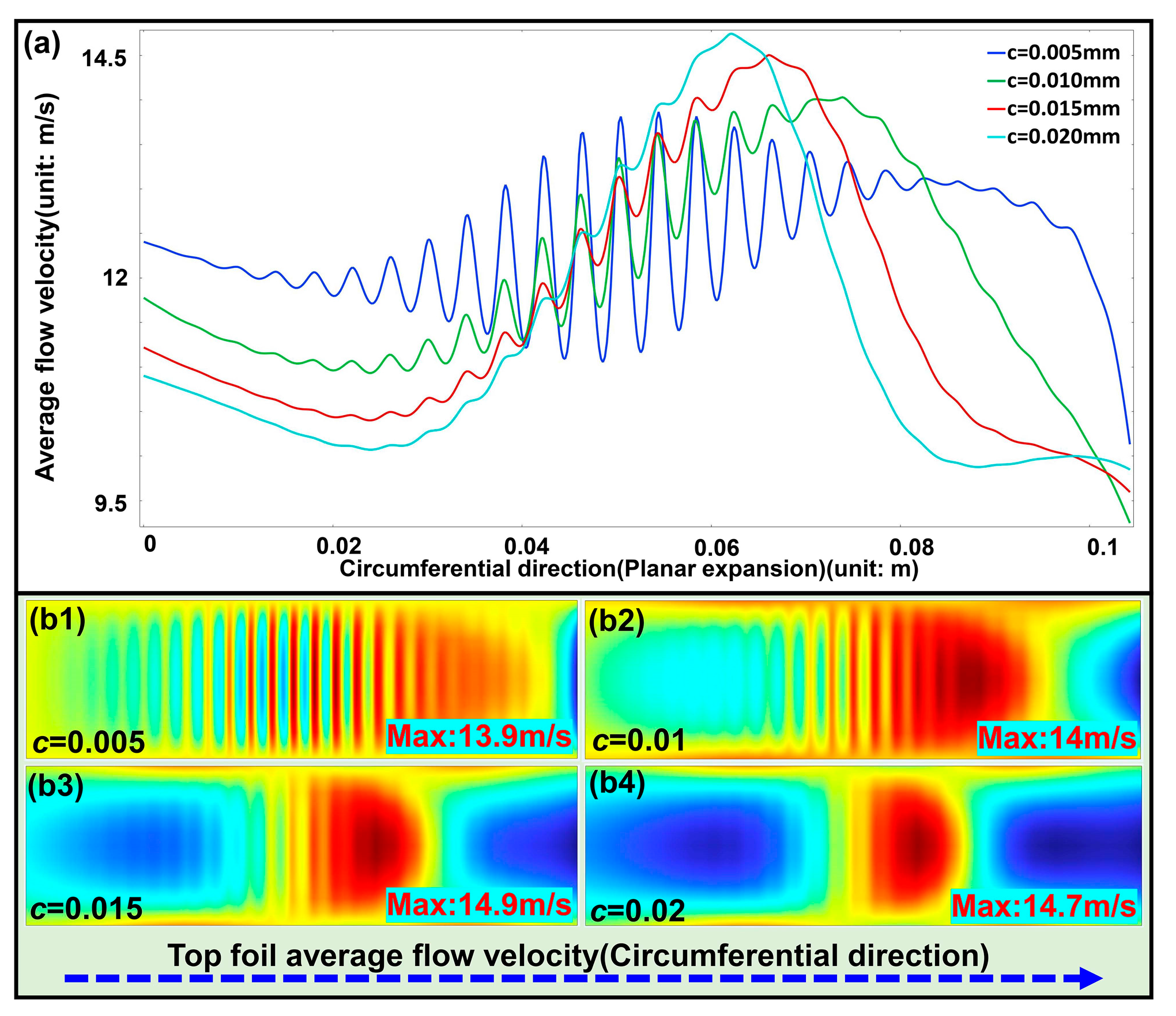 After the simulation, average flow velocity results on the top foil surface under different eccentricities and clearances are extracted for analysis. As shown in