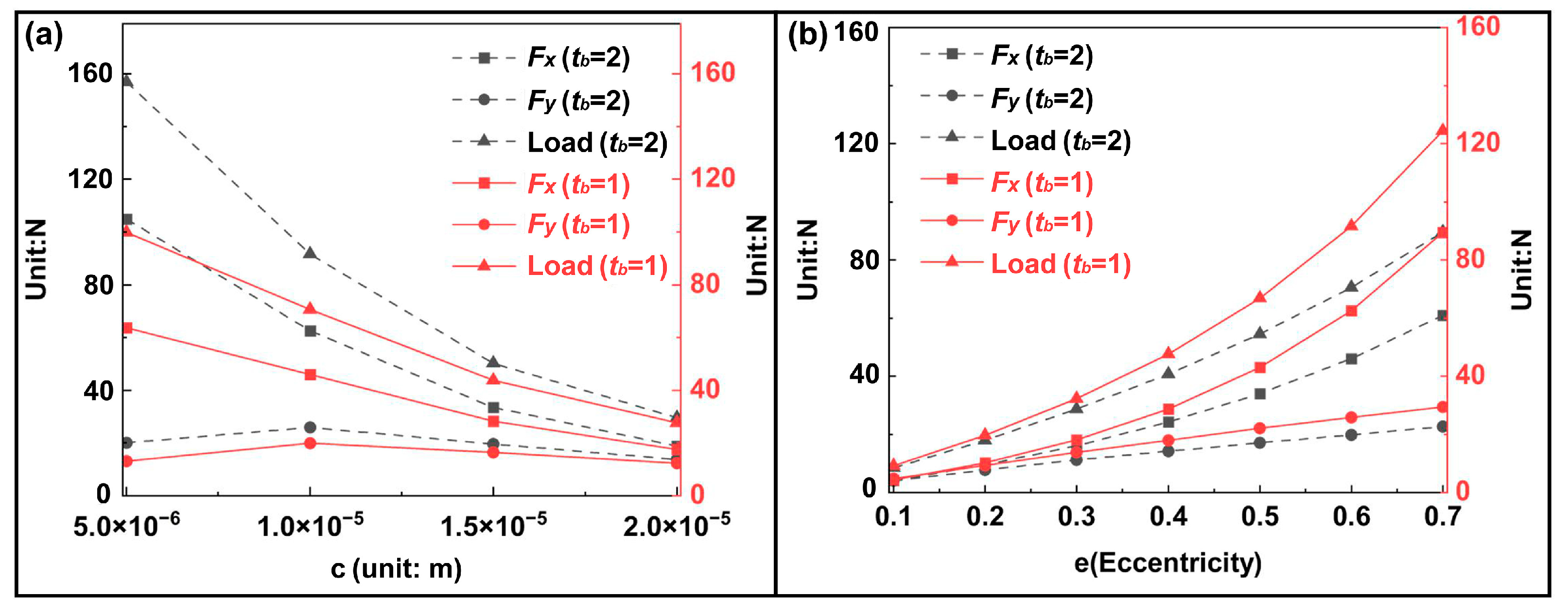 5.3. Effect of Bearing Clearance and Eccentricity on Loading Capacity