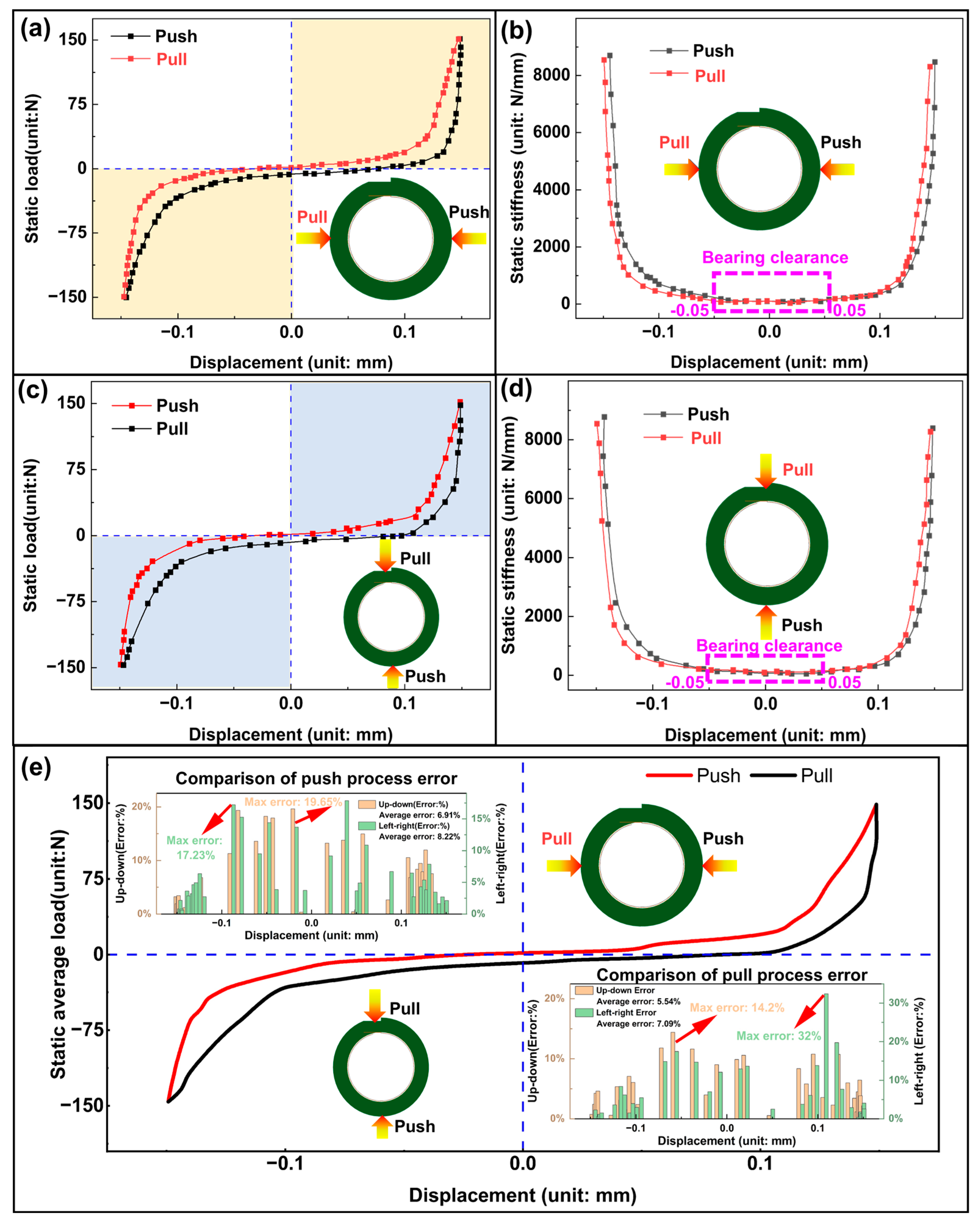 Faverage and expressed as a percentage error. The upper inset (Comparison of push process error) shows that, for the push process, the up-down error has an average value of 6.91% with a maximum of 19.65%, whereas the left-right error has an average value of 8.22% with a maximum of 17.23%. The lower inset (Comparison of pull process error) indicates that, for the pull process, the average errors are 5.54% (up-down) and 7.09% (left-right). Most data points remain below about 20%, although a few local peaks appear, with maximum errors of 14.2% in the up-down direction. The largest error of 32% occurs in the pull process at a displacement where the load–displacement curve becomes very steep and the sample-average load is relatively small. In this region, even a modest absolute difference in load between repeated measurements (for example, due to slight stick–slip behavior at the foil-shaft interface, micro re-seating of the bump foils, or small alignment changes during loading) is magnified when normalized by the small average value, leading to a high percentage error. This peak, therefore, reflects a local amplification of system-level measurement jitter rather than a systematic directional bias. Overall, the average error levels (about 5–8%) demonstrate that the static load- displacement measurements are highly repeatable and that the bearing exhibits good isotropy between the left-right and up-down directions.
