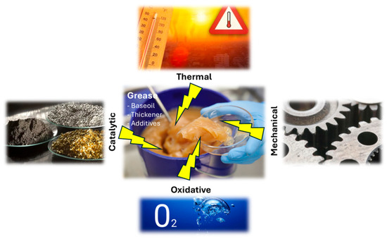 In technical applications, lubricants may suffer irreversible damage due to a wide range of causes (Figure 1). Thermo-oxidative degradation is highly dependent on the surrounding conditions. In non-encapsulated systems, oxidation of the lubricant results in the formation of acids, polymerization products, condensates, and deposits. This process is governed by factors such as temperature, the presence of catalysts (e.g., metal surfaces or wear particles), oxygen availability, and the accumulation of degradation products. In addition, grease aging—and thus degradation and polymerization—along with insufficient lubrication, particularly at elevated temperatures and high rotational speeds, or even electrical current passage, can lead to coking effects [3,6].