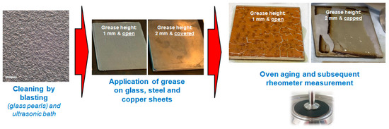 In this thermal/catalytic aging or screening test, lubricating greases (Greases 1–16) were stored isothermally for several days in a temperature-controlled oven on catalyst plates made of steel (S235JR), high-purity copper (99.8%), or inert glass. Prior to grease application, all steel and copper plates were cleaned of oxides and thus “activated” by glass bead blasting (Figure 2). Residual contaminants on all substrates were subsequently removed using boiling-range benzine in an ultrasonic bath. The precise application of the required grease quantity and layer thickness was ensured using a grease gauge. Two application methods were employed: