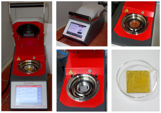 RapidOxy with open reaction chamber and grease samples placed in a glass dish (top right) as well as on glass and brass plate (bottom center and right).