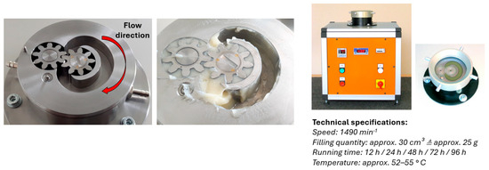 Purely mechanical loading of the grease structure was applied using the Klein shear apparatus by Albert Engineering (Clausthal-Zellerfeld, Germany). This device subjects greases to controlled shear under defined conditions. The grease is circulated in a closed loop, operating similarly to a gear pump at constant rotational speed (n = 1490 min−1) (Figure 6). Unfortunately, it is not possible to determine the torque or the force between the tooth flanks with this device. Therefore, it is also not possible to determine the lubricating film height and thus the shear rate.