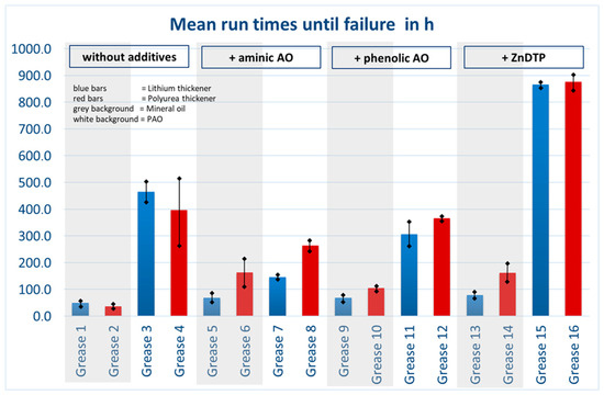 All diurea-thickened greases (white background) exhibited substantially longer running times, despite the 20 °C higher test temperature of 160 °C compared with lithium soap greases. Mineral oil combined with diurea thickener, even without additives, achieved the third-longest average lifetime. Interestingly, the use of AO additives often reduced lifetime. Zinc dialkyldithiophosphate (ZnDTP) was effective only in diurea-based greases, whereas the effect in lithium-thickened greases was relatively minor. The amine additive increased the lifetime of lithium soap greases but tended to reduce it in diurea greases. The phenolic additive slightly extended the life of lithium soap greases but again reduced it in diurea greases compared with unadditivated references.