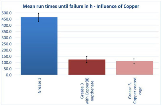 Comparison with grease 3 in the standard bearing (Figure 9; mean lifetime ~470 h) clearly showed that copper as a catalytic element strongly reduced lifetime, in some cases by up to a factor of four (Figure 10). Notably, both approaches—copper ion addition to the grease and electroplated copper cages—yielded nearly identical results.