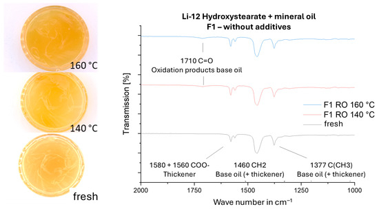 Subsequent oven aging was carried out at 140 °C for 24 or 72 h. During this period, the oven remained closed to maintain a constant oxidative atmosphere, and no air circulation was applied. Furthermore, greases with different base oils, thickeners, or additive packages were not aged simultaneously, in order to prevent cross-contamination caused by evaporation or transfer effects. After oven aging, the greases were removed and cooled to room temperature.