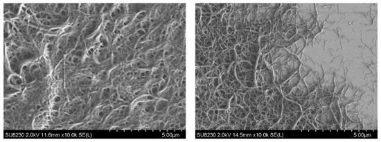 Rawat et al. investigated paraffin greases doped with graphene oxide [41]. Oil was extracted with n-hexane by rinsing for 15 min, followed by drying at 60 °C. Samples were then gold-coated to enhance secondary electron signals to obtain a good contrast. Lin et al. analyzed greases recovered from spherical roller bearings. Preparation involved rinsing with n-hexane, immersion for 15 min, drying in a vacuum desiccator, further drying at 35 °C, plasma cleaning, and iridium coating [42].