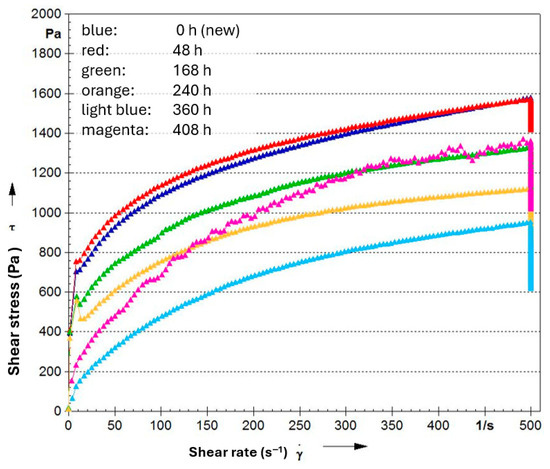 As early as 1998, Kuhn investigated the structural degradation of lubricating greases and observed that variations in rheological properties correlate with structural breakdown [18]. Kuhn later introduced the term “grease wear” as an indicator of changes induced by tribological stress [11].