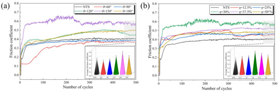 Time-varying curve of cyclic friction coefficient: (a) different texture angles; (b) different texture area ratios.
