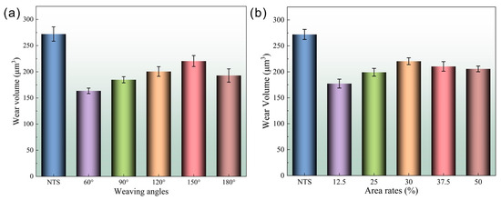 Plot of wear volume variation for different rail surfaces: (a) different angles; (b) different area rates.