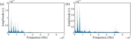 Figure 9 displays the amplitude-frequency spectra of signals during the stable phase for both the NTS specimen and the textured specimen with parameters θ = 150° and η = 30%. Analysis reveals that the dominant frequency components of both specimens are concentrated in the low-frequency range of 0~2 × 105 Hz. Notably, the textured specimen demonstrates lower spectral peak amplitudes compared to the NTS specimen. The NTS specimen reaches a maximum peak amplitude of approximately 1.25 × 10−4 V, whereas the peak amplitude of the textured specimen remains below 1 × 10−4 V. Furthermore, in the high-frequency range of 4–6 × 105 Hz, the textured specimen displays significant spectral components, while the NTS specimen shows only minimal amplitude in this region. These findings suggest that the introduction of wavy textures not only diversifies the types of signals generated during friction but also substantially enhances the intensity of high-frequency components. Therefore, the friction-induced vibration characteristics of the textured specimen are marked by reduced amplitudes in the low-frequency range and significantly strengthened high-frequency signal content.
