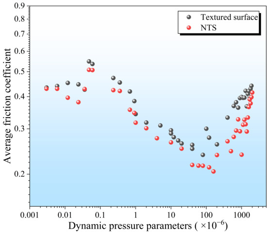 Friction and wear tests were conducted on both the NTS specimen and the textured specimen with parameters θ = 150° and η = 30%, yielding the variation curves under different hydrodynamic parameters shown in Figure 11. Each data point represents the average of three measurements. The obtained curves align well with the general form of the Stribeck curve [28]. Observations indicate that the friction coefficient exhibits a significant correlation with the hydrodynamic parameter P, and the textured surface consistently demonstrates higher friction coefficients than the NTS specimen. As the hydrodynamic parameter P increases, the friction coefficient generally shows a trend of initially decreasing and then increasing. When P < 0.1 × 10−6, the friction coefficients of both surfaces fluctuate only slightly, remaining around 0.51 and 0.57, respectively, indicating that both surfaces are in the boundary lubrication regime. Upon entering the mixed lubrication regime, the friction coefficient continues to decrease with increasing P, reaching its minimum at P = 100 × 10−6 Pa, where the friction coefficients of the NTS and textured specimens are 0.2 and 0.24, respectively. At this point, the lubrication state transitions from mixed lubrication to hydrodynamic lubrication. With further increase in the hydrodynamic parameter, the friction coefficients of both specimens begin to rise. Overall, the Stribeck curve of the textured surface is clearly shifted upward compared to that of the NTS.