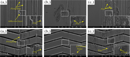 Figure 12(c1,c2) present the surface damage morphologies of the NTS and textured specimens under hydrodynamic lubrication conditions. It can be clearly observed that both surfaces are largely free of plastic deformation caused by interfacial shear stresses. However, the NTS specimen exhibits extensive spalling and ploughings, while the textured specimen also shows numerous ploughings and spalling pits. These spalling pits are attributed to localized impact and transient high temperatures induced by the collapse of high-pressure cavitation bubbles, leading to cavitation erosion and fluid erosion [29]. Surface micro-cracks are likely caused by the oil wedge effect [30], wherein normal pressure forces lubricant into existing spalling pits, thereby aggravating surface damage. Overall, the extent of surface damage under hydrodynamic lubrication lies between that observed in boundary and mixed lubrication regimes—more severe than under mixed lubrication but significantly milder than under boundary lubrication conditions.