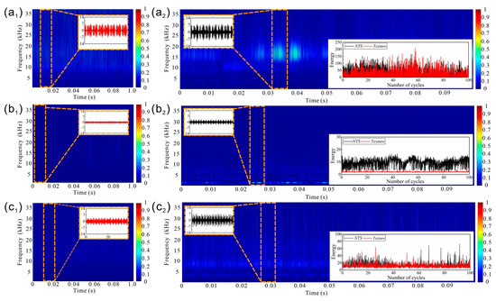CWT maps of friction vibration signals for NTS specimens and texture specimens under different lubrication conditions: (a1) Texture & boundary lubrication condition; (a2) NTS & boundary lubrication condition; (b1) Texture & mixed lubrication condition; (b2) NTS & mixed lubrication condition; (c1) Texture & hydrodynamic lubrication condition; (c2) NTS & hydrodynamic lubrication condition.