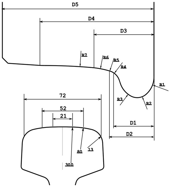 The turnout investigated in this study is built with the UIC60 rail profile, one of the most widely adopted standards. Although turnout rails feature variable cross-sections along their entire length, the UIC60 rail profile was chosen as a reference in this study. This choice is widely recognized in the literature for the study of multi-point wheel–turnout contact, providing a standard benchmark for comparing different wheel profiles while maintaining consistency across studies [26]. Using this standard profile allows the analysis to focus on the influence of wheel geometry on contact characteristics without affecting the overall relevance of the results.