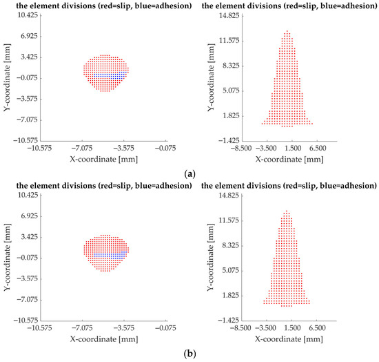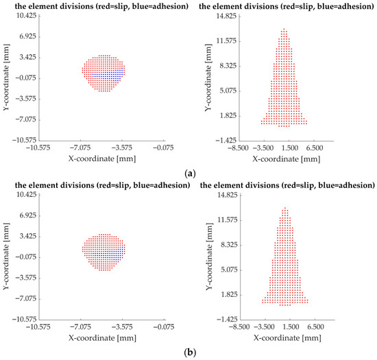 The distribution of adhesion and slip zones in the contact area for the S1002 profile: (a)—inclination 1:20, (b)—inclination 1:40.