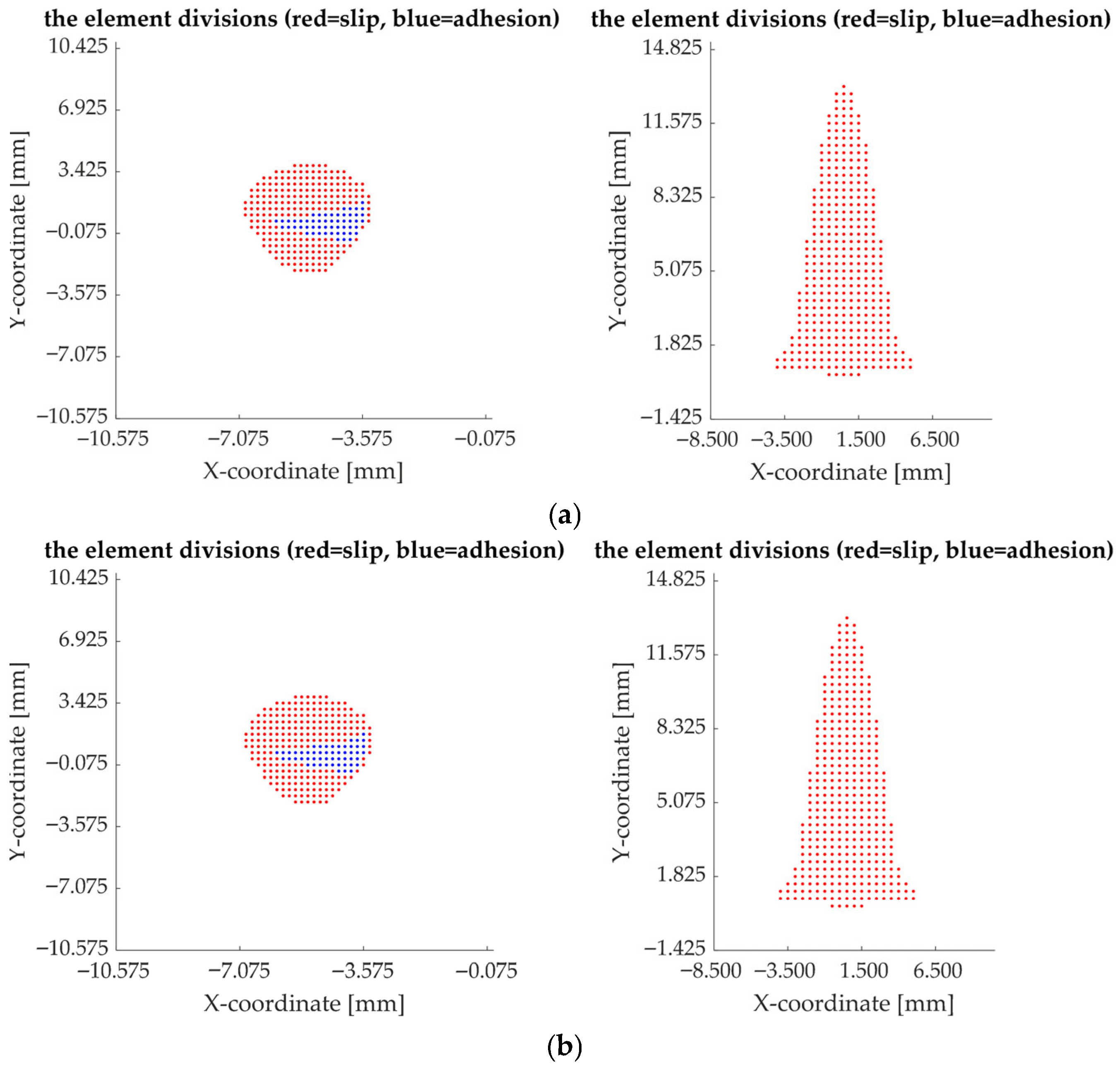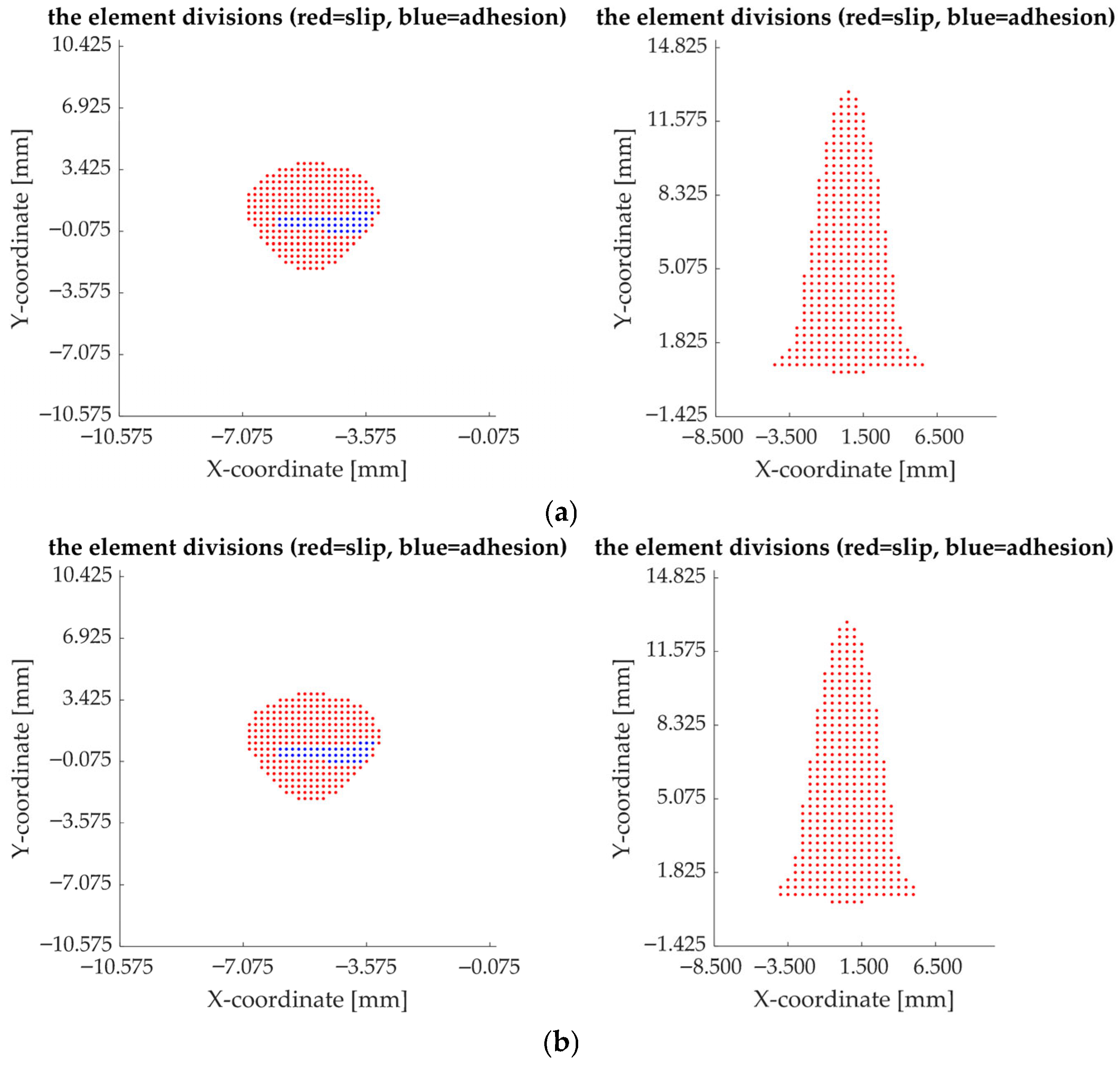 13], allowing efficient and accurate determination of normal and tangential stress distributions, adhesion and slip regions, and energy dissipation in the contact patch. This makes it particularly well-suited for analyzing frictional concentrated contact in railway applications [