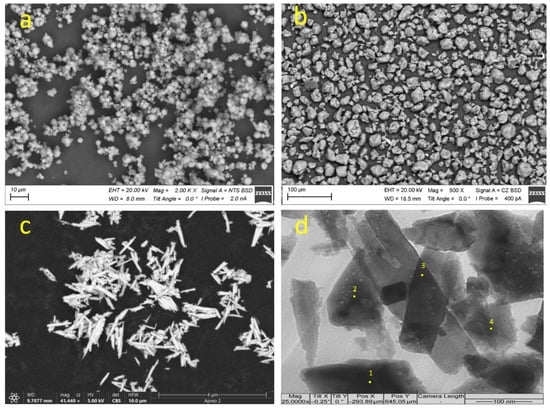 SEM BSD (a–c) micrographs of as-received PTFE (a), PES (b) granules, and zirconium tungstate crystallites (c). TEM image of ZT particles (d) produced by hydrothermal synthesis. The numbers and points identify places where EDS point spectra have been obtained (Table 1).