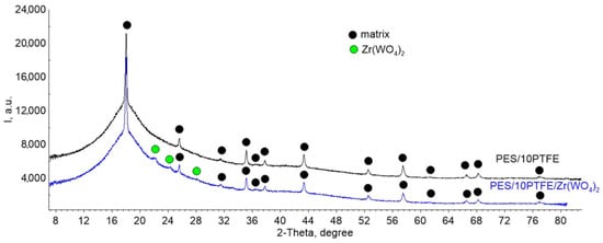 X-ray diffractograms of the as-prepared PMC composites have been obtained, which testify to the crystallinity of the polymer component, attributed to the PTFE particles (Figure 5). The X-ray diffraction peaks were identified as those obtained from a hexagonal crystalline PTFE phase IV, which normally exists in the temperature interval of 19–30 °C [30]. The PES/PTFE/ZT composite additionally demonstrates some small peaks identified as belonging to a hexagonal α-ZrW2O8 phase, which is stable in heating up to 155 °C [36] when it transforms to a cubic form, which is also capable of negative thermal expansion. However, it was shown that α-ZrW2O8 retains in the PEI even after compression molding at 370 °C since it is known that compression stress serves to stabilize it. The ZrW2O8 decomposition temperature is about 770 °C [34].