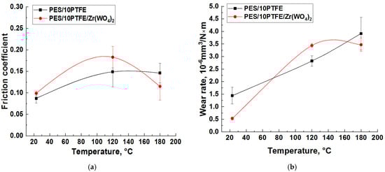 Coefficient of friction (a) and wear rate (b) as functions of temperature for PES/PTFE and PES/PTFE/ZT composites.