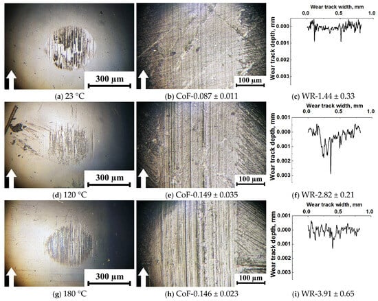 The worn surfaces of counterparts demonstrated the presence of transfer films, the amounts of which reduce with increasing the wear rate (Figure 8a,d,g and Figure 9a,d,g). The densest transfer film was generated on the ball tested at T = 23 °C against the PES/PTFE sample, which corresponds to a minimum wear rate of 0.53 × 10−6 mm3/Nm. In other words, the transfer film proved to be stable on the worn surfaces of both counterparts in the temperature interval from 23 to 180 °C. In addition, sliding at higher temperatures resulted in the formation of deeper wear grooves as compared to those formed at 23 °C, i.e., the adhesive–abrasive wear mechanism by compacted wear particles was aggravated by the temperature.