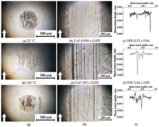 The CoF dependencies on the wear path length allow for observing that sliding at a room temperature of 23 °C on both PES/PTFE and PES/PTFE/ZT PMCs is characterized by the presence of running-in regimes followed by steady friction regimes (Figure 7a,b). The running-in stages can be observed also in CoF dependencies obtained after sliding at 120 °C, but this time the CoF’s behavior is characterized by high-frequency CoF oscillations and some long-time periodicity. The CoF oscillation amplitudes are higher in the case of sliding on PES/PTFE, while longer period CoF intervals are observed for the PES/PTFE/ZT PMC. More steady CoF behavior was obtained during sliding on the PES/PTFE/ZT at 180 °C.