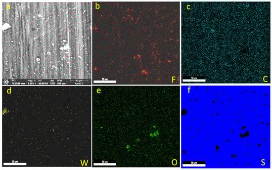 An SEM image of the worn surface obtained after sliding at 23 °C on the PES/PTFE/ZT composite (Figure 10a) demonstrates the presence of a tribological layer composed of smeared PTFE and ZT particles (Figure 10b–e). The worn surfaces resulting from sliding at 120 °C represent smooth areas with grooves (Figure 11a) covered by PTFE/ZT refined fragments (Figure 11b–e). The dark areas in the sulfur maps (Figure 10f, Figure 11f, and Figure 12f) coincide with those depicting PTFE/ZT particles in Figure 10b and Figure 11b. The generation of smooth film is typical of sliding on PMCs containing antifriction PTFE components under room temperatures [37].