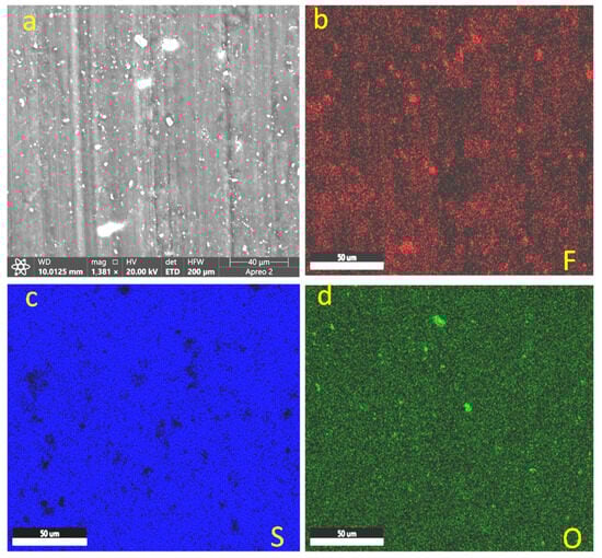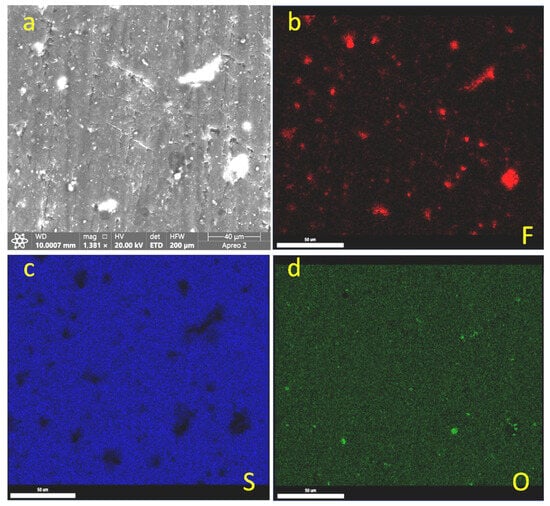PES/PTFE samples tested at 120 °C (Figure 14a–d) demonstrate their worn surface, which is less smooth than that of the PES/PTFE/ZT one (Figure 10a) but also has deep grooves and ZT particles on the background of the sulfur map (Figure 13b–d).