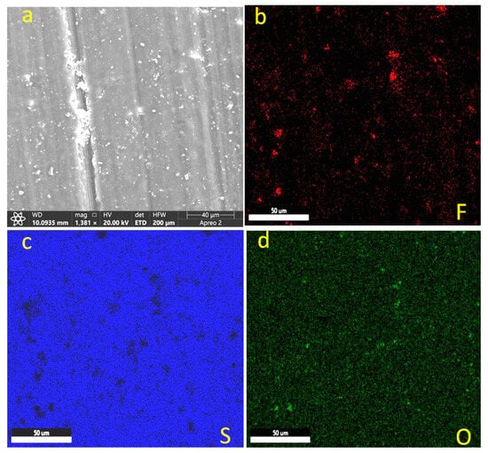 The worn surface morphology obtained after sliding at 180 °C (Figure 15a) is almost similar to that of the PES/PTFE/ZT sample tested at 180 °C (Figure 12a); however, it is characterized by deeper wear grooves and areas covered by shallow ones. The PTFE elements, such as fluorine and oxygen, are distributed over the worn surface (Figure 15b–d).