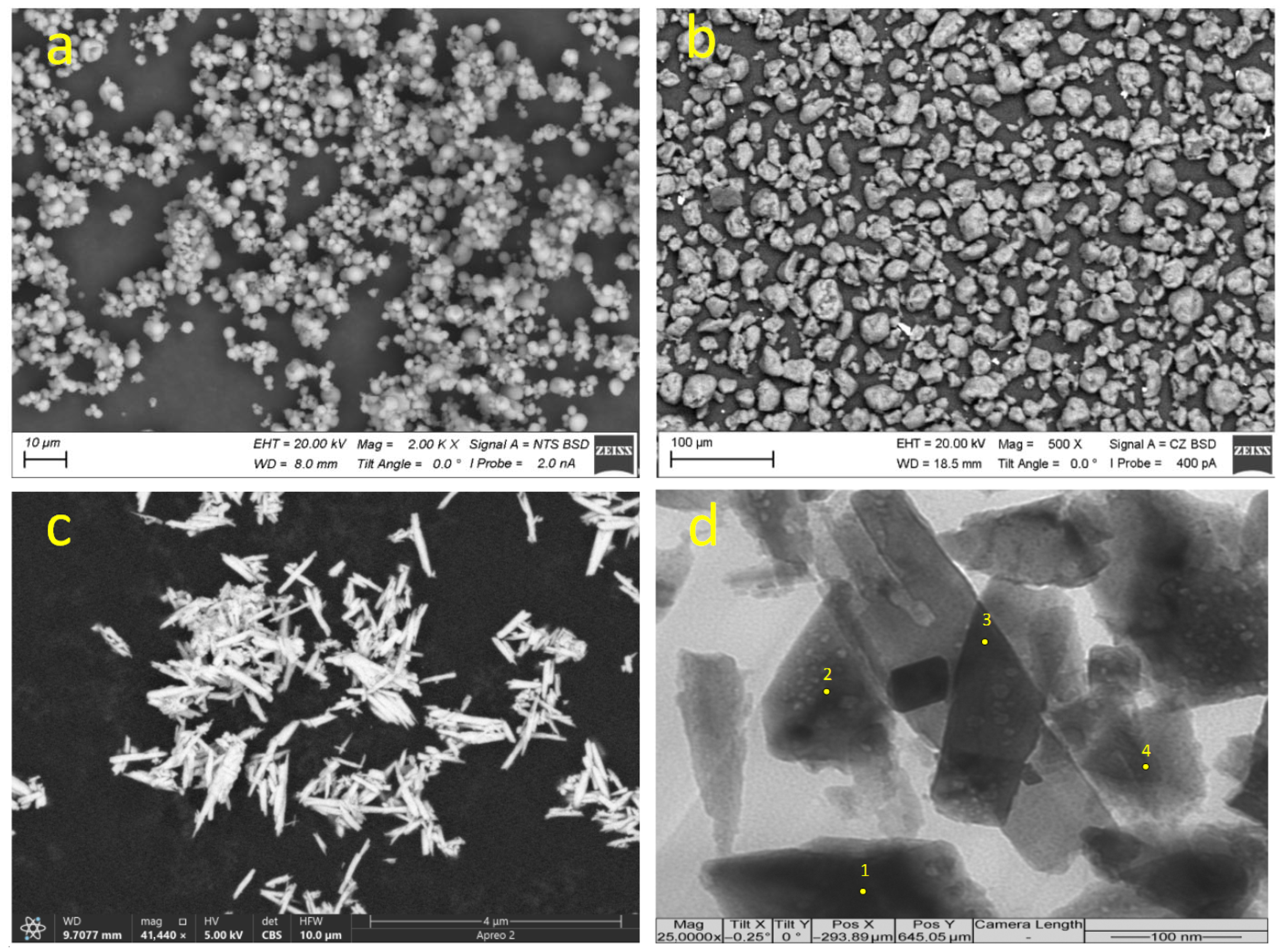 Figure 1. SEM BSD (ac) micrographs of as-received PTFE (a), PES (b) granules, and zirconium tungstate crystallites (c). TEM image of ZT particles (d) produced by hydrothermal synthesis. The numbers and points identify places where EDS point spectra have been obtained (Table 1).