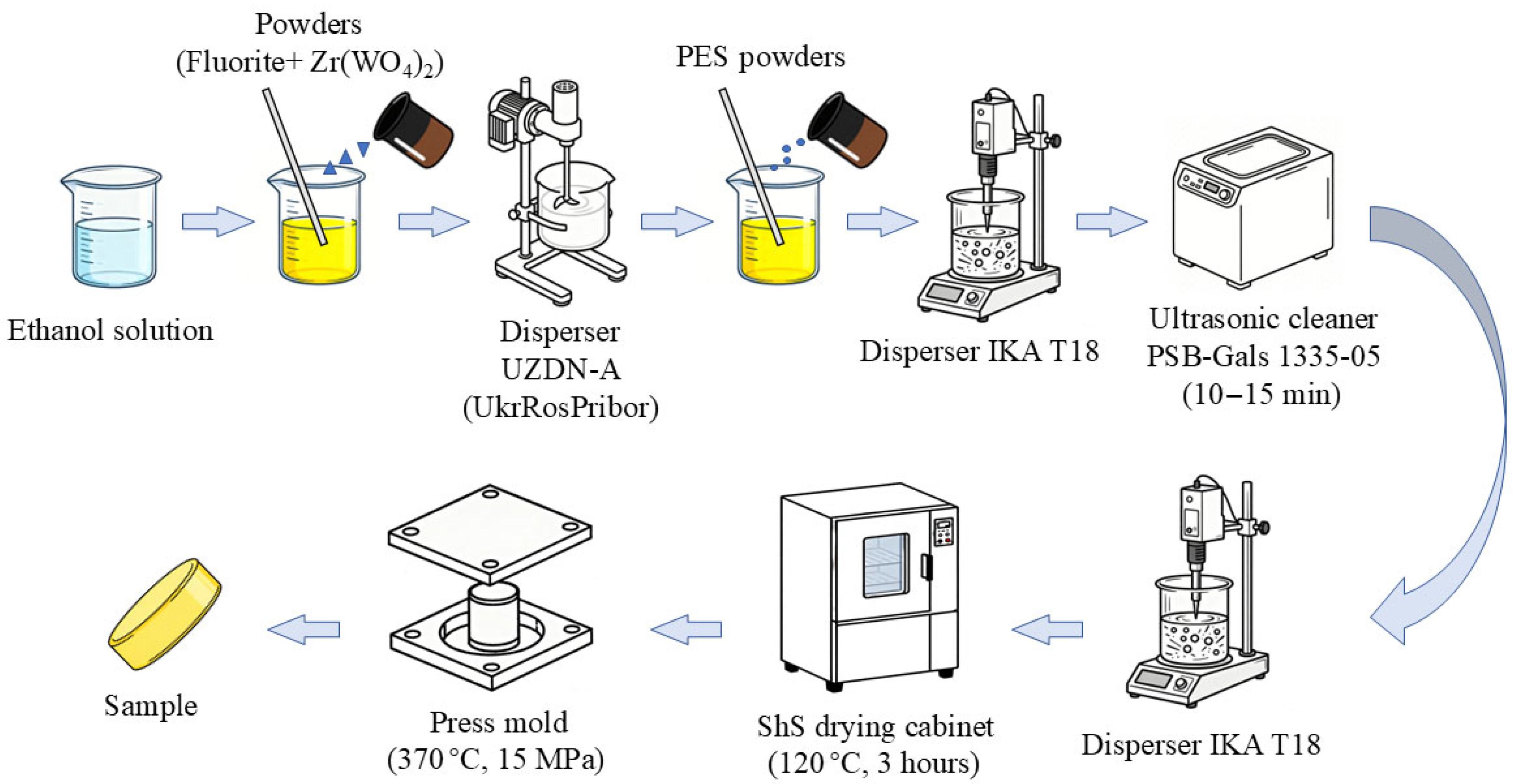 The next stage was deposition of deagglomerated ZrW2O8 particles on the PTFE ones in ethanol with the use of a disperser UZDN-A (UkrRosPribor, Moscow, Russia). The PES particles were then intermixed with either neat PTFE or PTFE/ZT particles using an IKA T18 (IKA-WERKE, Staufen im Breisgau, Germany) disperser, subjected to sonication for 10–15 min by means of an ultrasonic cleaner (‘PSB-Gals’ Ultrasonic Equipment Center, Moscow, Russia), and again dispersed to provide better intermixing and dispersion of the components (Figure 2). The resulting suspension of particles was dried in an ShS-20-02-SPU drying cabinet (Smolensk SKTB SPU Inc., Smolensk, Russia), followed by milling in an IKA M20 mill (IKA-WERKE, Staufen im Breisgau, Germany). Compression molding of the powder blends was performed at a pressure of P = 15 MPa and a temperature of T = 370 °C. Finally, the consolidated disk samples were cooled down to room temperature at a cooling rate of 2 °C/min.