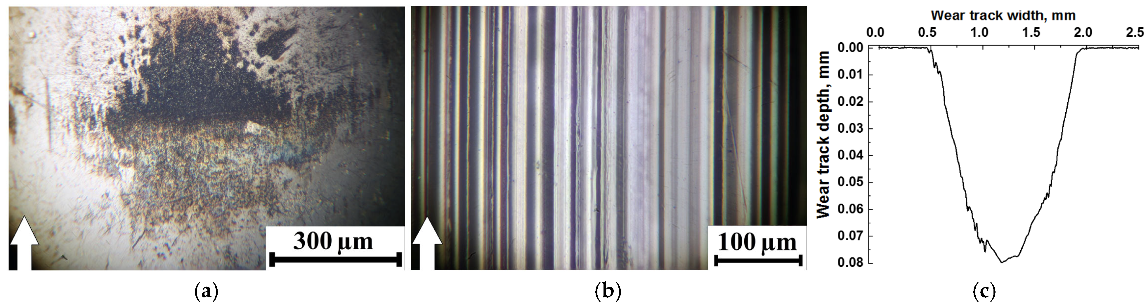 A high-temperature tribotester ‘THT-S-BE-0000′ (CSEM, Neuchâtel, Switzerland) allowed obtaining tribological data with the use of a ball-on-disk (ASTM G99-23) testing scheme at a normal load of P = 5 N and a sliding velocity of V = 0.3 m/s. The total wear path length was L = 1000 m. The counterparts were ∅6 mm AISI 52100 steel 60 HRC balls with Ra = 0.02 µm surface roughness. These parameters ensured obtaining steady friction and wear regimes in sliding at elevated temperatures without any scoring, ploughing, or buckling. The test conditions were similar to those used in our previous studies [25,28].