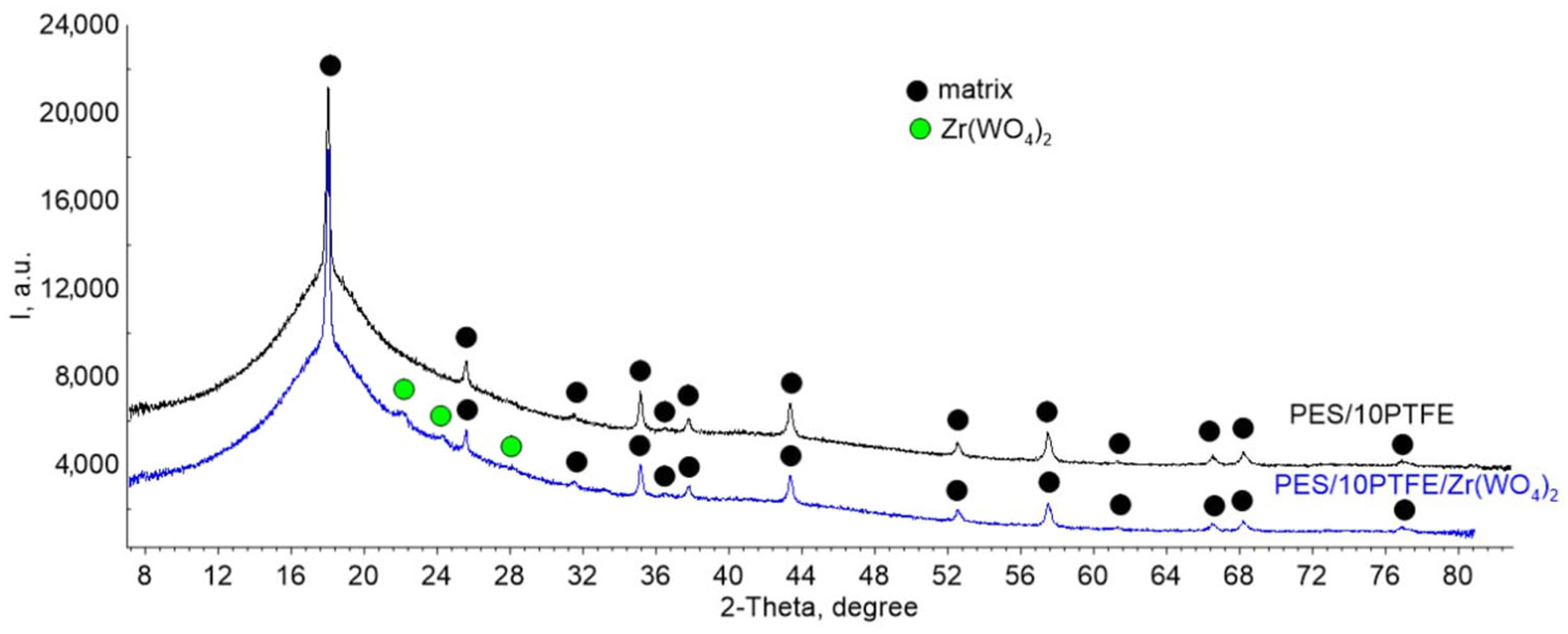 X-ray diffractograms of the as-prepared PMC composites have been obtained, which testify to the crystallinity of the polymer component, attributed to the PTFE particles (Figure 5). The X-ray diffraction peaks were identified as those obtained from a hexagonal crystalline PTFE phase IV, which normally exists in the temperature interval of 19–30 °C [30]. The PES/PTFE/ZT composite additionally demonstrates some small peaks identified as belonging to a hexagonal α-ZrW2O8 phase, which is stable in heating up to 155 °C [36] when it transforms to a cubic form, which is also capable of negative thermal expansion. However, it was shown that α-ZrW2O8 retains in the PEI even after compression molding at 370 °C since it is known that compression stress serves to stabilize it. The ZrW2O8 decomposition temperature is about 770 °C [34].
