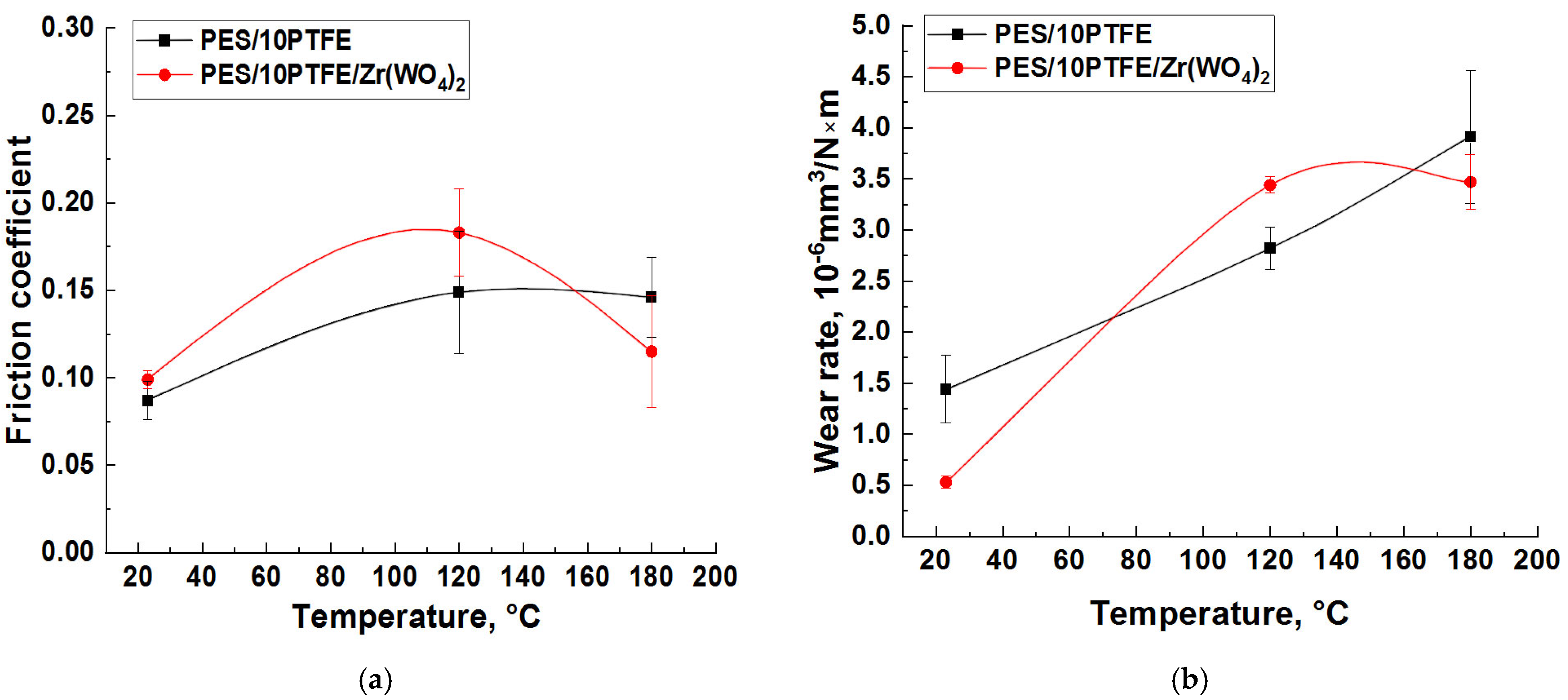 Figure 6. Coefficient of friction (a) and wear rate (b) as functions of temperature for PES/PTFE and PES/PTFE/ZT composites.