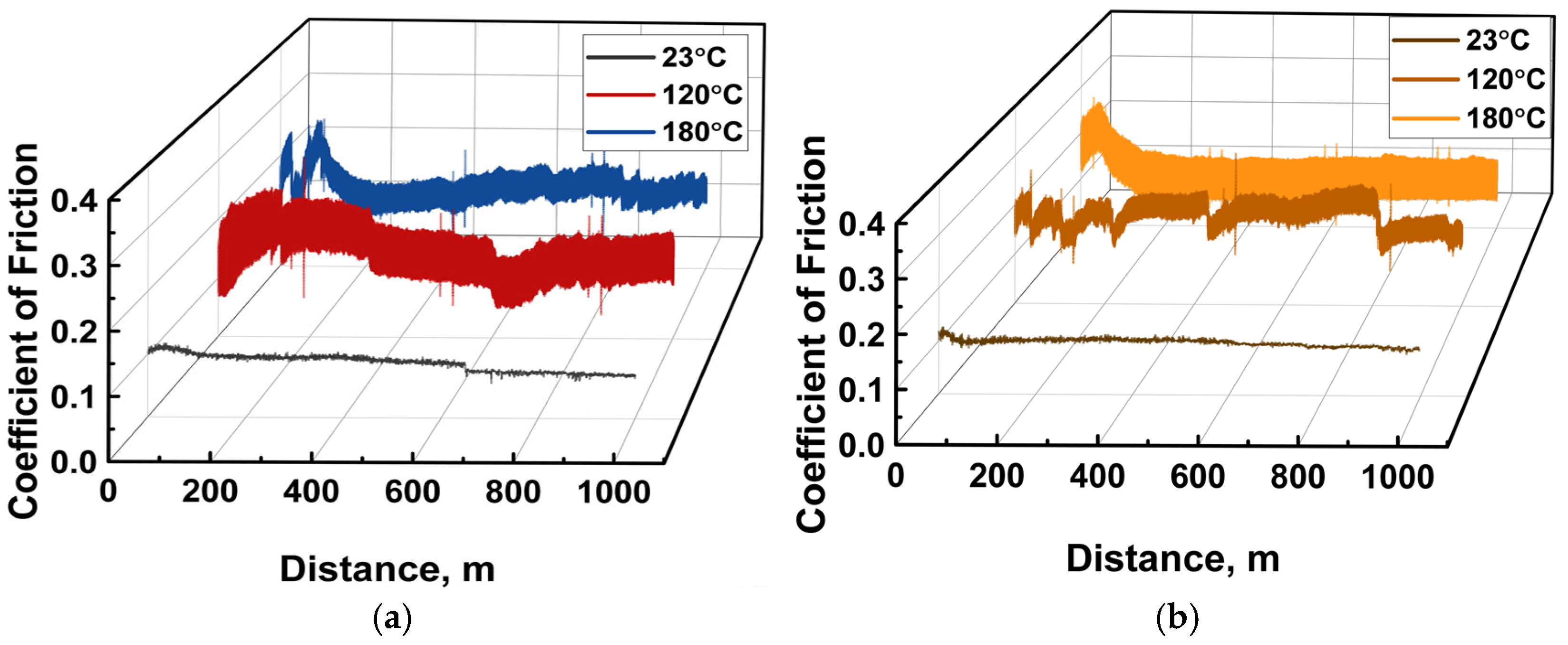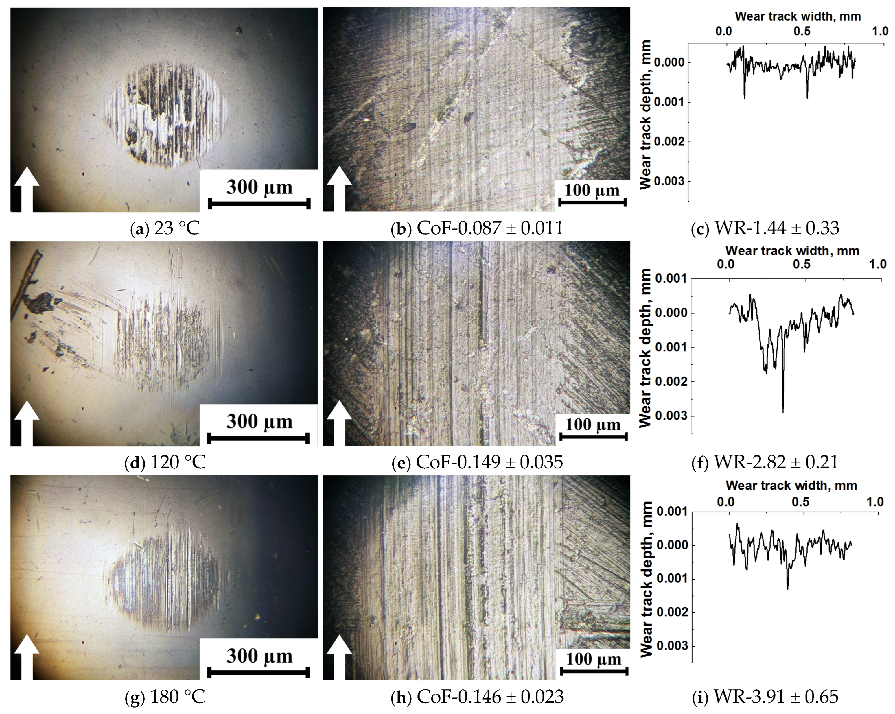 The CoF dependencies on the wear path length allow for observing that sliding at a room temperature of 23 °C on both PES/PTFE and PES/PTFE/ZT PMCs is characterized by the presence of running-in regimes followed by steady friction regimes (Figure 7a,b). The running-in stages can be observed also in CoF dependencies obtained after sliding at 120 °C, but this time the CoF’s behavior is characterized by high-frequency CoF oscillations and some long-time periodicity. The CoF oscillation amplitudes are higher in the case of sliding on PES/PTFE, while longer period CoF intervals are observed for the PES/PTFE/ZT PMC. More steady CoF behavior was obtained during sliding on the PES/PTFE/ZT at 180 °C.