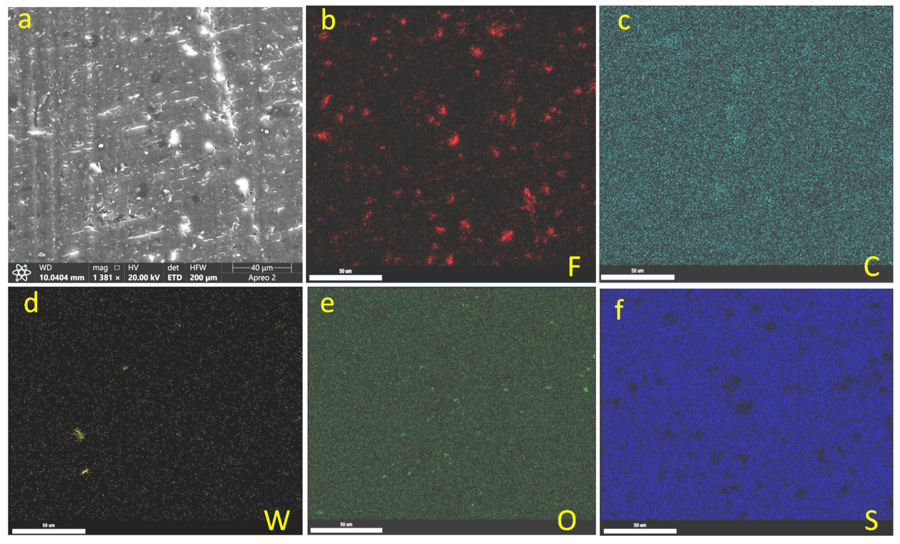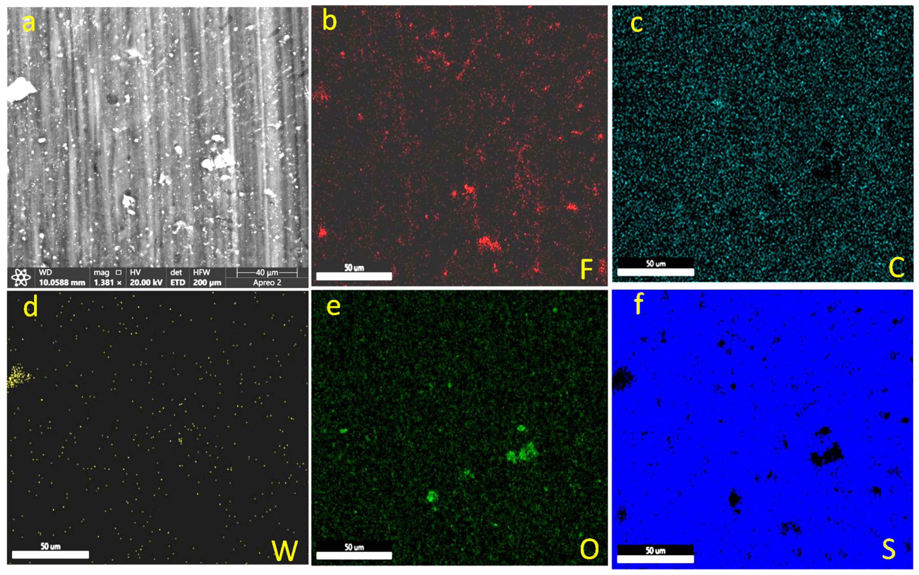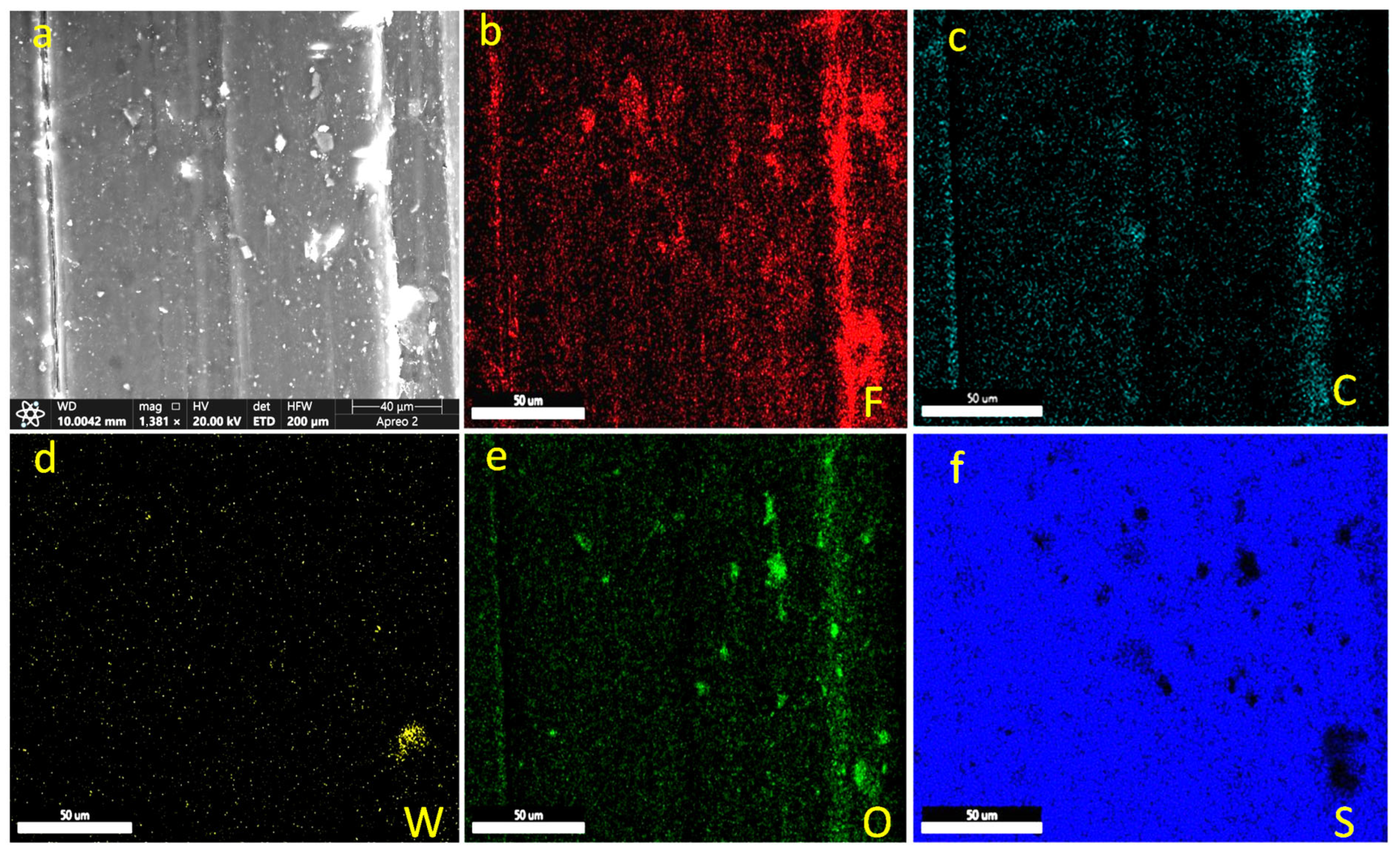 An SEM image of the worn surface obtained after sliding at 23 °C on the PES/PTFE/ZT composite (Figure 10a) demonstrates the presence of a tribological layer composed of smeared PTFE and ZT particles (Figure 10b–e). The worn surfaces resulting from sliding at 120 °C represent smooth areas with grooves (Figure 11a) covered by PTFE/ZT refined fragments (Figure 11b–e). The dark areas in the sulfur maps (Figure 10f, Figure 11f, and Figure 12f) coincide with those depicting PTFE/ZT particles in Figure 10b and Figure 11b. The generation of smooth film is typical of sliding on PMCs containing antifriction PTFE components under room temperatures [37].