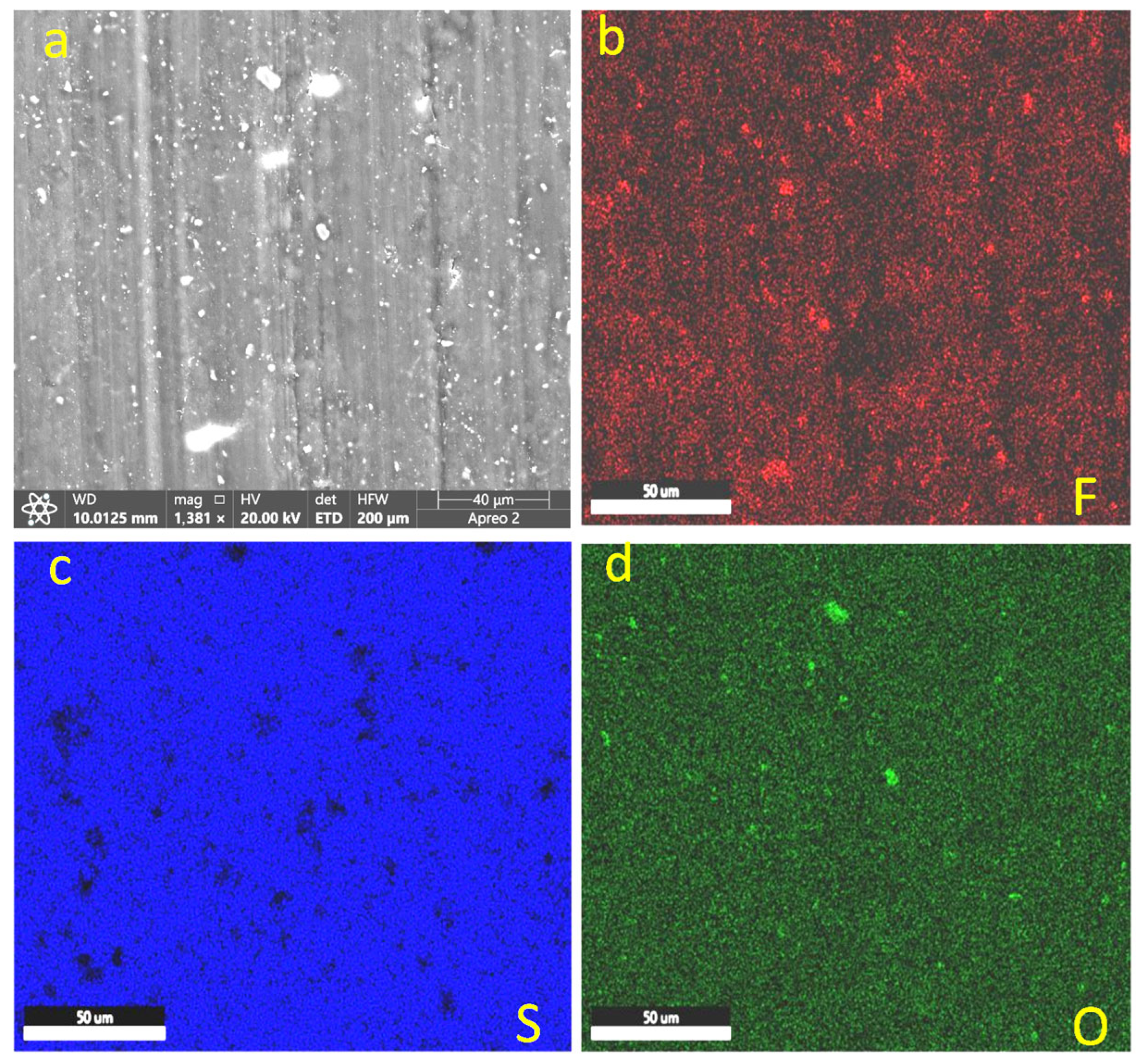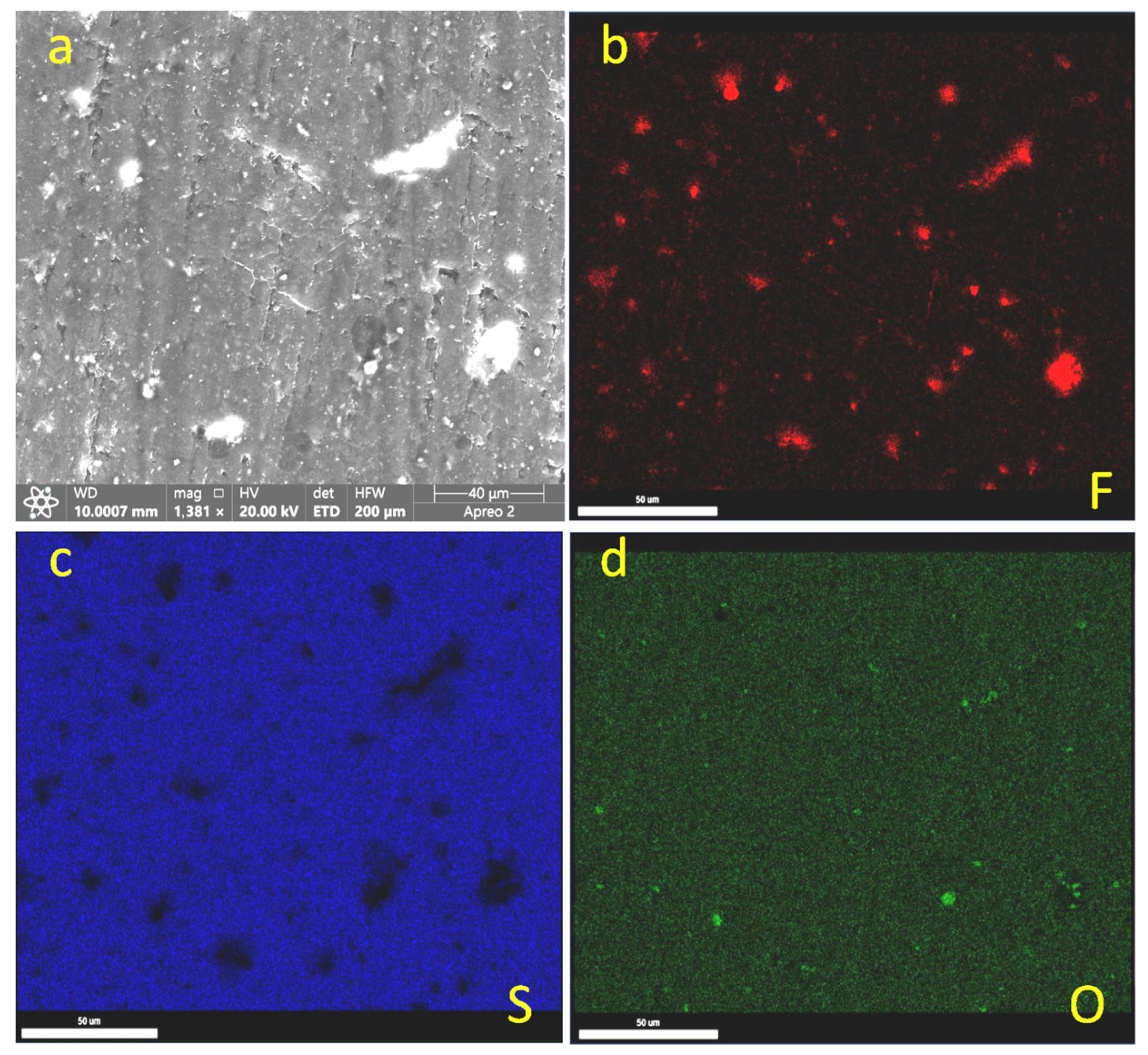 The worn surface morphology obtained after sliding at 180 °C (Figure 15a) is almost similar to that of the PES/PTFE/ZT sample tested at 180 °C (Figure 12a); however, it is characterized by deeper wear grooves and areas covered by shallow ones. The PTFE elements, such as fluorine and oxygen, are distributed over the worn surface (Figure 15b–d).