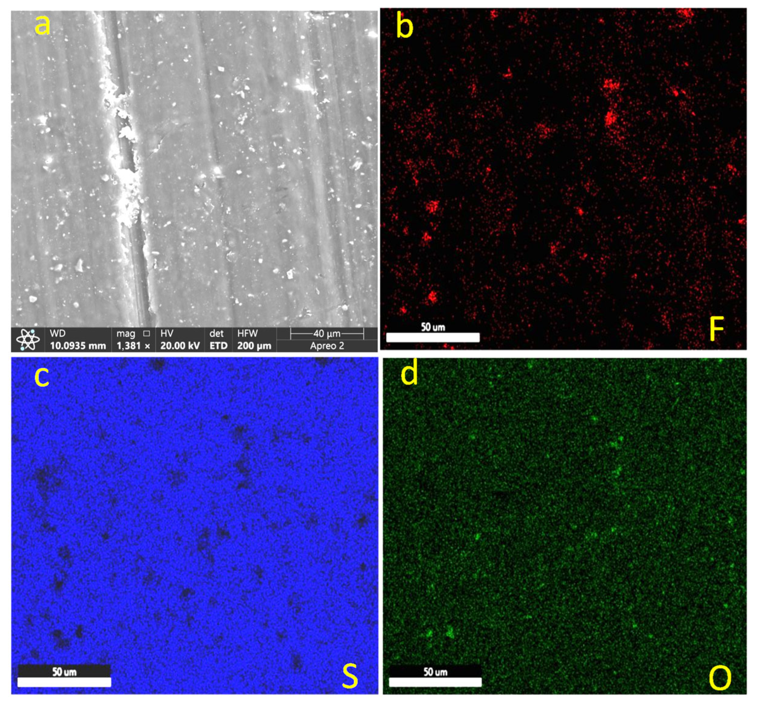 Figure 14. SEM SE image of worn surface (a) and corresponding EDS element maps (bd) for PES/PTFE sample tested at 120 °C.
