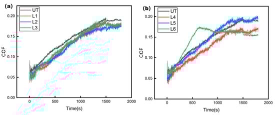 COF–time curves from friction and wear tests: (a) COF–time: UT vs. L1–L3; (b) COF–time: UT vs. L4–L6; (c) COF–time: UT vs. L7–L9; (d) Mean COF comparison: UT and L1–L9.