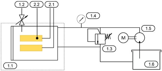 The test specimen, configured as a parallel-plate capacitor, is placed inside a pressure vessel (1.1) during the experiments. Both the temperature sensor (2.2) and the voltage measurement (2.1) are electrically insulated from the pressure vessel. Venting air from the chamber is performed manually via a valve (1.2) to ensure a fully flooded chamber. The test fluid is stored in a reservoir (1.6). The volumetric flow is generated by a pump (1.5). The required test pressure within the pressure chamber is regulated using a manual pressure relief valve (1.3). Pressure monitoring is carried out using a pressure gauge (1.4) installed in the supply line leading to the tank.