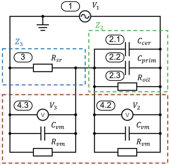 The measurement was conducted based on the respective voltages and voltage divisions, as illustrated in Figure 4. The elements of the electric circuit are listed in Table 1. In addition to the primary measurement parameters, the Figure also includes all relevant influencing factors, such as the capacitance of the ceramic layer (2.1), the electrical resistance of the intermediate medium (2.3) as well as the resistance and capacitance of the voltage measurement circuit (4.1 and 4.2). This model is the basis for the evaluation method presented in Section 2.3.