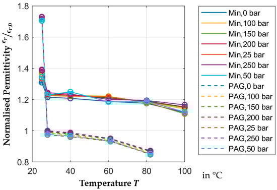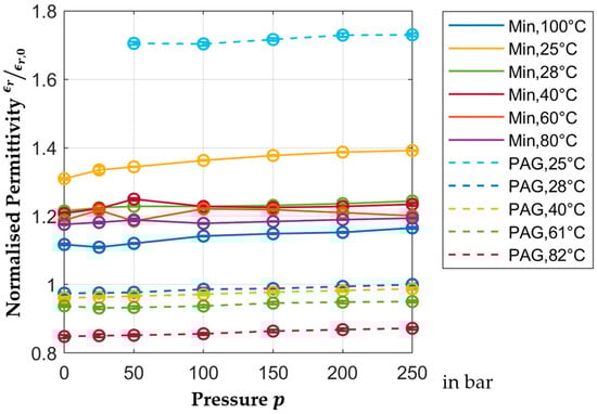 - What temperature and pressure dependence of the permittivity can be observed for a mineral oil and polyalkylene glycol (PAG) oil assuming operating parameters within a journal bearing?