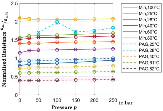 The measurements are conducted in a fully parametric manner using the lubricants listed above. The temperature varies between 20 °C and 100 °C, while the pressure ranges from 1 to 250 bar. These temperature and pressure ranges are typical for journal bearing applications and are therefore of interest for this contribution [25]. The individual test points are listed in Appendix B. Measurements without lubricant are also conducted in the pressure chamber to eliminate any external influence. The electric frequency is kept constant at