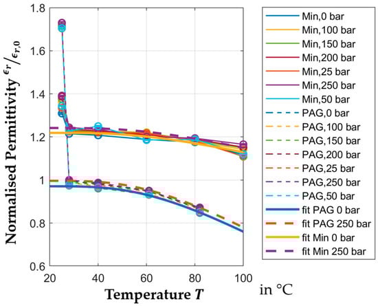 Tuero et al. [7] investigated the electrical properties of three transmission fluids. They have found the permittivity to change between 20 °C and 100 °C by only 4%; however, a significant dependence of the conductivity on the temperature was noted. Whether they investigated synthetic or mineral oils was not described.