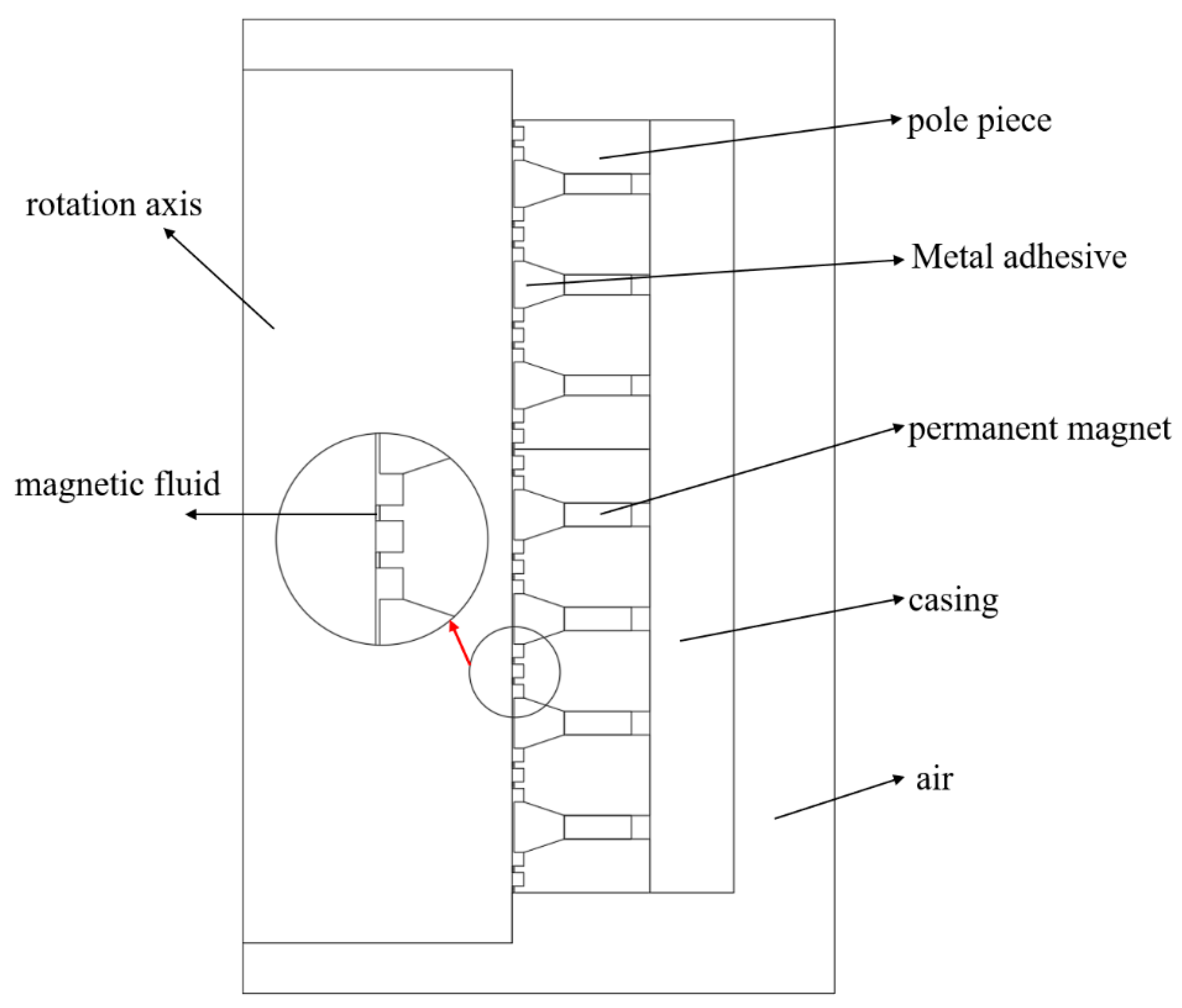 - The reduction in the sealing gap may cause mutual friction between the rotating shaft and the pole teeth. Therefore, through the study of different combinations of three materials for the rotating shaft and the pole shoe, it was found that when the rotating shaft and the pole shoe are made of different materials, the sealing effect may be better.