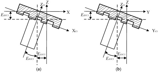 where the spindle’s five thermal errors are denoted as EAOC1, EBOC1, EXOC1, EYOC1, and EZOC1. Rotors in the X-, Y-, and Z-directions are represented by , , and , respectively. The product of exponentials (POE) model for the spindle’s error is denoted as , while the POE matrices for errors in the X-, Y-, and Z-directions are represented by , , and , respectively.