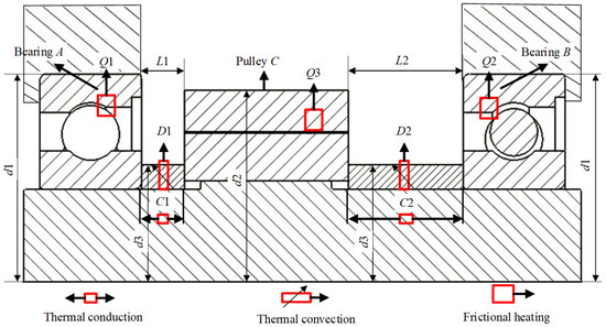 where the frictional heat generation rates of bearings A, B, and pulley C are represented by ΔQ1i, ΔQ2i, and ΔQ3i, respectively. The number of measured temperature points is denoted by n. The heat conduction rates from pulley C to bearings A, B along the spindle shaft are represented by ΔC1i and ΔC2i, respectively. Additionally, the convective heat transfer rates between the shaft segments (between pulley C and bearing A, and between pulley C and bearing B) and the surrounding air are represented by ΔD1i and ΔD2i, respectively. The heat required for pulley C’s instantaneous temperature rise is denoted by ΔQxi.