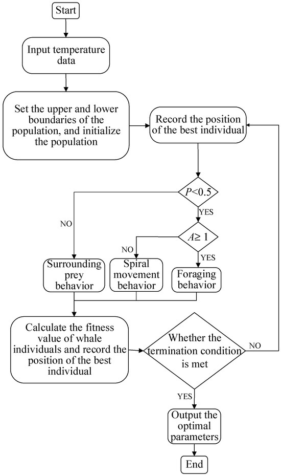 The WOA is employed to optimize the physical parameters of the temperature field model. These parameters include the friction coefficients μ1 (for bearings A, B) and μ2 (for pulley C), as well as the applied loads p1 (bearing A), p2 (bearing B), and p3 (pulley C). The process flow is shown in Figure 3.