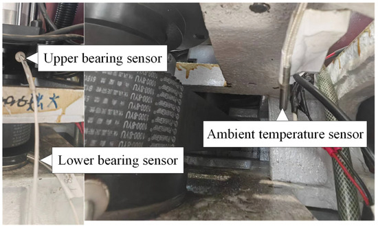 Thermal deformation in the machine tool is primarily attributed to heating effects. Heating primarily arises from friction between the inner and outer rings of bearings, between pulleys on the shaft, and between belts. By analyzing the spindle structure discussed in Section 3.1 and constructing a spindle temperature field model, temperature measurements were obtained by positioning sensors near the upper and lower bearings and the pulley. Figure 6 illustrates the placement of these sensors. Table 1 displays the spindle’s structural parameters.